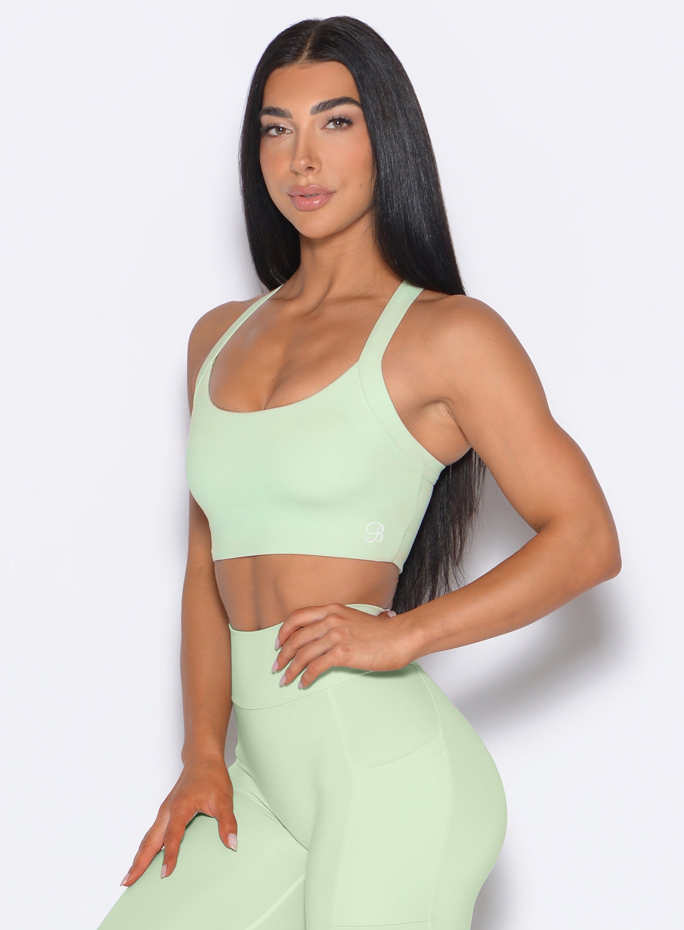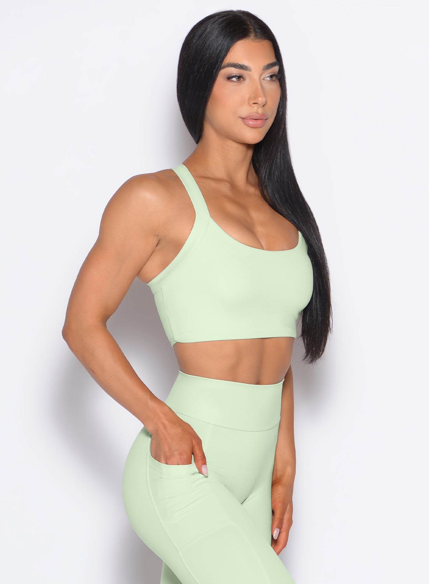 The High Impact Bra in Cool Matcha delivers the perfect balance of support and style. Designed as a padded high impact sports bra. it features thick adjustable straps and a secure hook and eye back clasp for a customizable fit. The scoop neckline creates a streamlined finish. while removable padding with light push-up lets you choose your level of lift. Double layered fabric adds coverage. and the buttery soft hand feel ensures lasting comfort. Built as a workout sports bra for high performance. it moves with ease from gym sessions to daily loungewear.