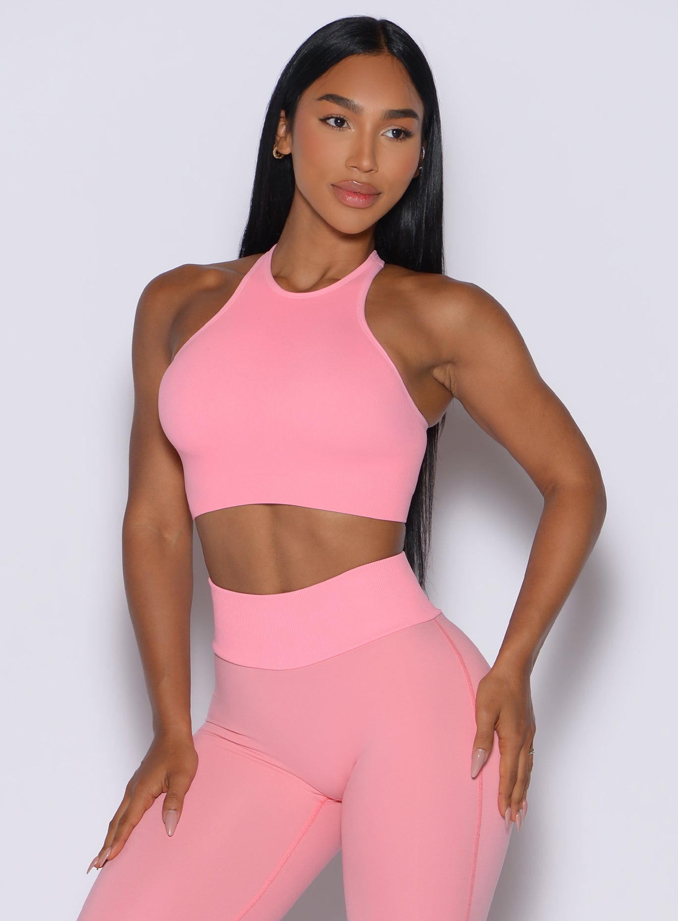 The perfect high-neck shoulder cut-out design shows off your pump while providing excellent support and coverage where you need it most. This rib racerback style is ideal for upper body workouts. making this bra a must-have for the weight room.