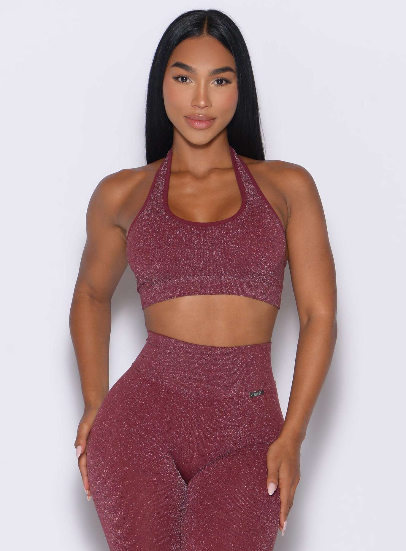 You absolutely must have this bra! Not only is the shimmer effect unbelievably stunning. but the halter design and backless style also provide a flattering. sleek look. With a seamless ribbed under-bust band. it’s perfect for workouts and can effortlessly be worn with any outfit.