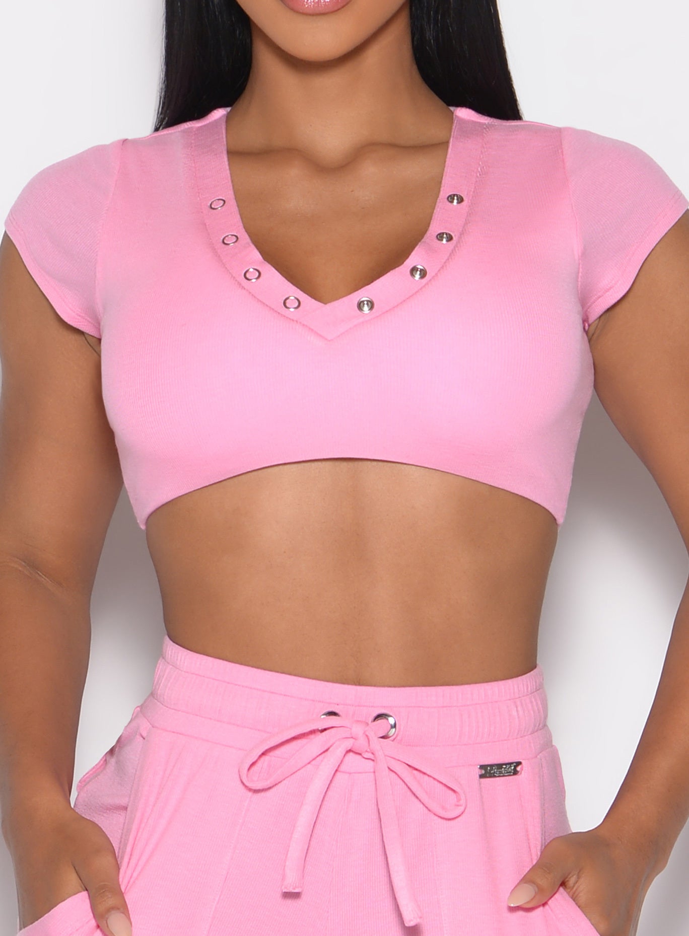 The Snap Detailed Top in Bubblegum Pink by Bombshell Sportswear brings effortless style to your lounge lineup. This cropped silhouette features a flirty V neck with snap accents for a bold yet comfy look. Built-in bra pads deliver light support. while the ribbed fabric hugs your curves in all the right places. Pair it with the Snap Rib Joggers or Snap Rib Shorts in Bubblegum Pink for a bold but coordinated matching set.